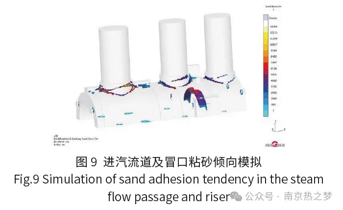 该高压内缸铸件进汽流道空间狭小且汽缸缸壁壁厚大,浇注完成后流道砂芯会被型腔内的钢液长时间高温烘烤,易形成粘砂。由于铸件整体壁厚较厚、热节大,因此所需的冒口也大,冒口周边温度较高,容易出现粘砂,MAGMA软件的粘砂倾向分析结果显示,冒口周围与进汽流道存在粘砂倾向,如图9所示。