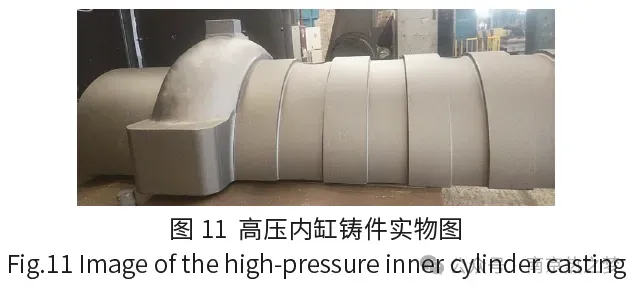 该高压内缸铸件已生产4套,造型过程操作方便,铸件壁厚控制合理,整个缸体经UT探伤检查未发现缩松缺陷,流道未发生粘砂问题。