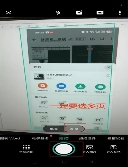 第二步:下载之后点开扫描全能王,到达这个界面后点击照相机这个图标开始扫描,先根据所扫描的图片的页数进行选择,如果材料为多页一定选多页,然后将手机摄像头对准要拍的物体,尽量拍正,然后点圆圈这个按钮。