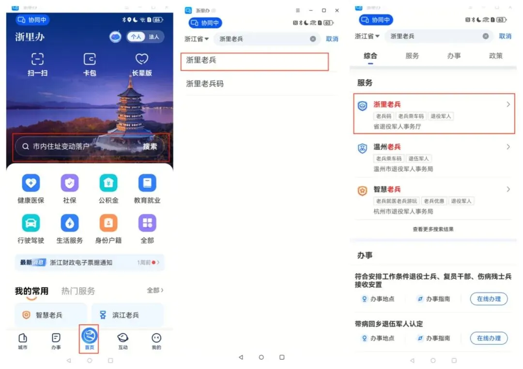 (3):在首页搜索栏输入浙里老兵,选择服务板块的【浙里老兵】。