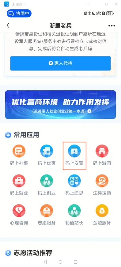 (4) 进入【浙里老兵】后,在常用应用选择【码上安置】模块,点击进入。
