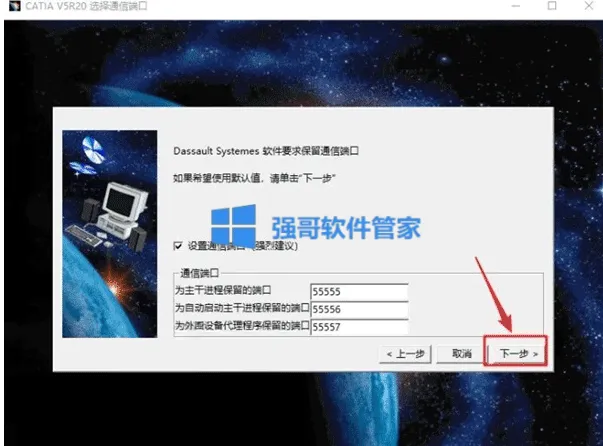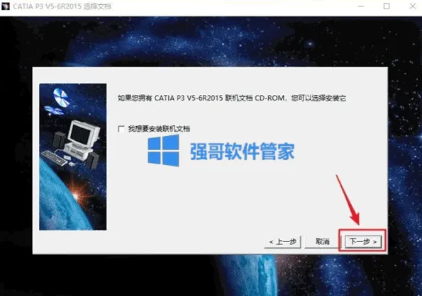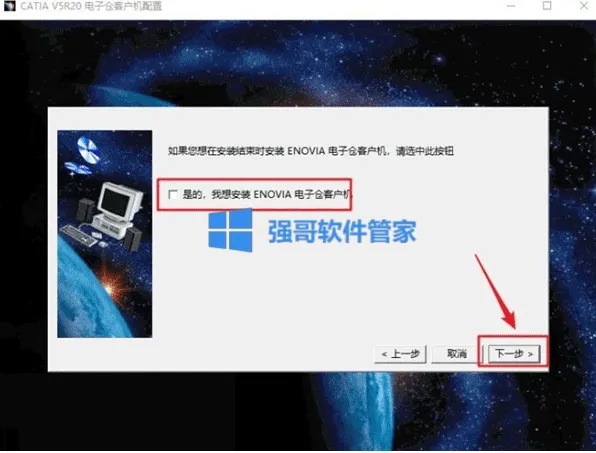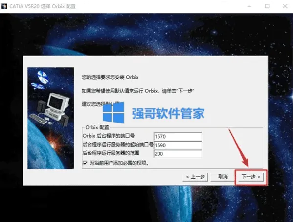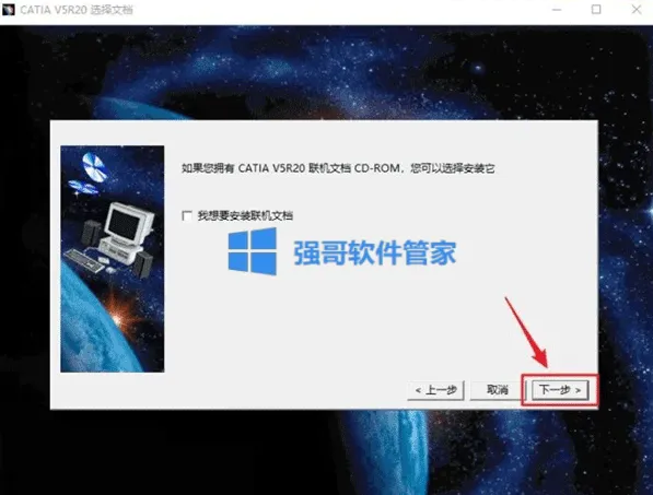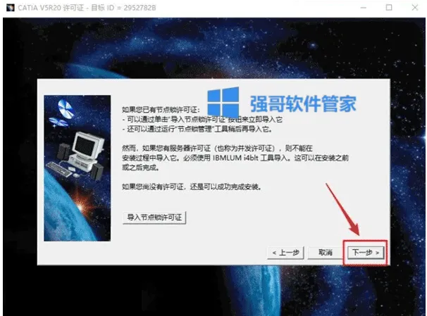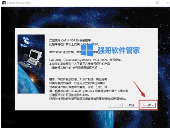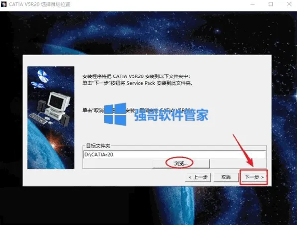 6.点击【下一步】(点击“浏览"选择步骤4在D盘新建的CATIAr20文件夹】