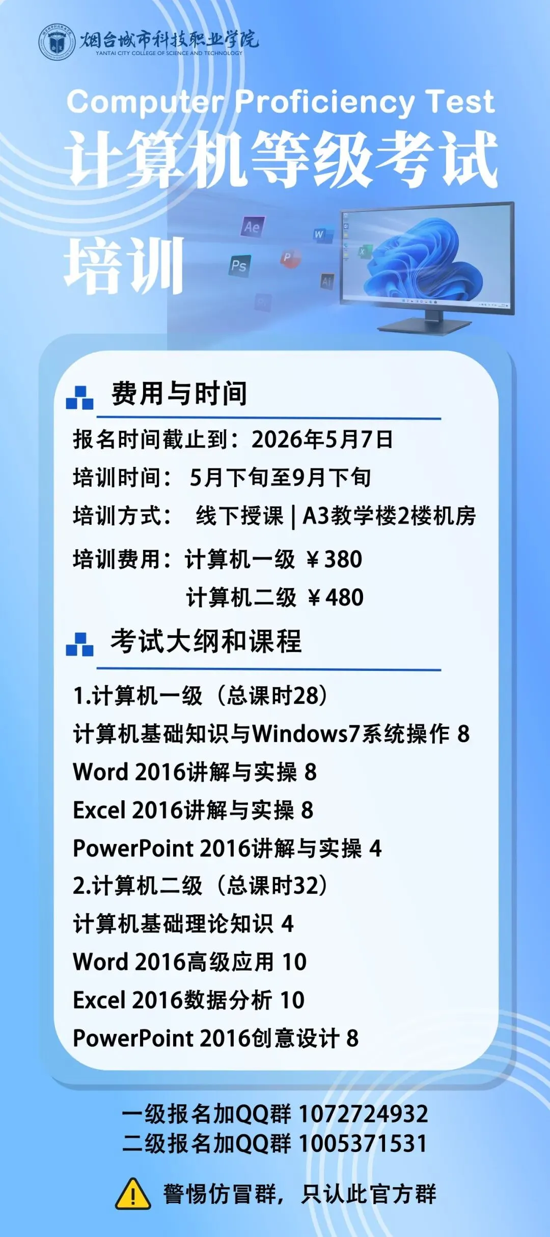 本次培训报名截止时间为2026年5月7日,培训周期为5月下旬至9月下旬,培训费用计算机一级380元、二级480元。