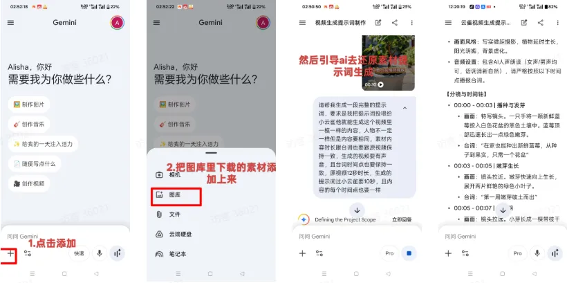 把下载的素材添加到你的AI上让他还原相关素材提示词,这里我用的是Gemini举例(因为我用习惯这个了)相关AI,像豆包,Deepseek,gpt或者claude用法相同,测试能生成适合自己的提示词即可。