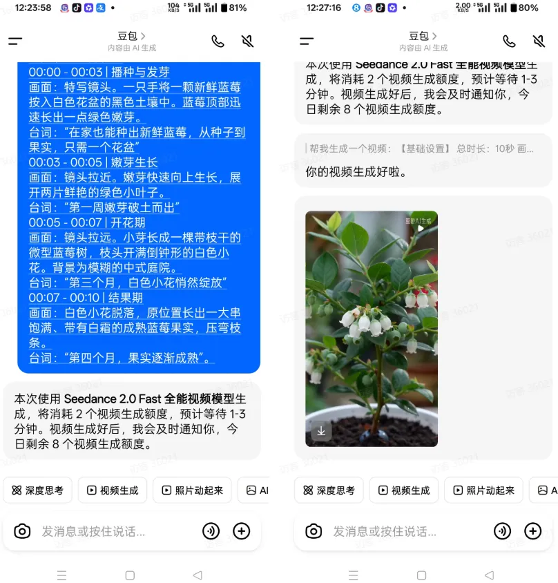 然后将生成的完整提示词投喂给豆包或者云雀里面的seedance2.0即可,seedance2.0目前的拟真度效果个人体验来说是最好的,豆包每天一个素材的生产额度是2,用完了多开几个抖音号绑定即可,豆包的使用最好是在白天跑素材,产出一条素材大概2-3分钟: