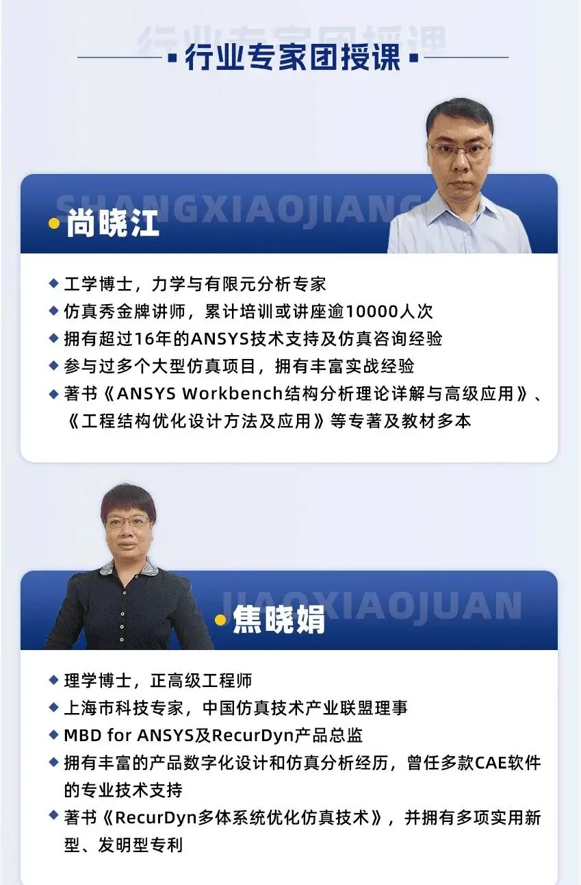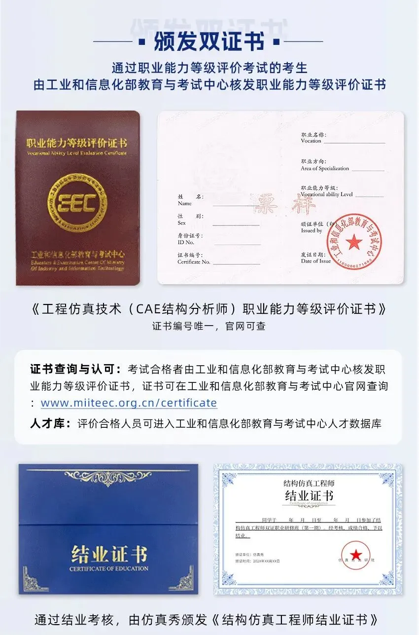 当AI工具成为标配,市场对仿真人才的要求将彻底改变:“会软件”变成基础门槛,“能决策”成为核心能力。届时再想转型,要补的课会比现在多得多。面对冲击,零碎的“自学”已经来不及了。你需要的是系统化、结构化、经过验证的能力体系,快速把自己从“工具人”升级为“决策者”。带你走完完整仿真分析流程:问题定义 → 模型简化 → 边界论证 → 结果解读 → 优化建议 → 报告撰写。做完2-3个,你就能在简历上写:“独立负责XX系统仿真分析,提出优化方案,降低重量/提升性能XX%。”通过考核,获得:《工程仿真技术(CAE分析师)职业能力等级评价证书》(工业和信息化部教育与考试中心颁发,官网可查),这张证书是你“系统学习+能力认证”的权威证明,帮你快速通过简历筛选。我们不请全职讲师,只请仍在产业一线、有15年以上经验的资深专家:(以workbench班讲师为例)与100+行业头部企业合作,优秀学员可获得专属内推机会想详细了解双证班的课程体系、师资安排和最新一期开班时间,可以扫码咨询 ,领取完整版大纲+案例,和试听。