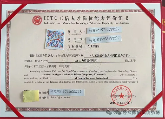 能力评测由工业和信息化部人才交流中心严格依据《工业和信息化人才岗位能力评价通则》精心组织实施。在完成AI关注国信弘创小马微信公众号获取更多报考详情人力资源管理师培训与评测班的系统课程后,经工业和信息化部人才交流中心严格把关,符合条件的学员将统一参加这场知识与能力的双重检验。关注国信弘创小马微信公众号获取更多报考详情通过AI人力资源管理师岗位能力评测的学员,可获得《IITC工信人才岗位能力评价证书》。