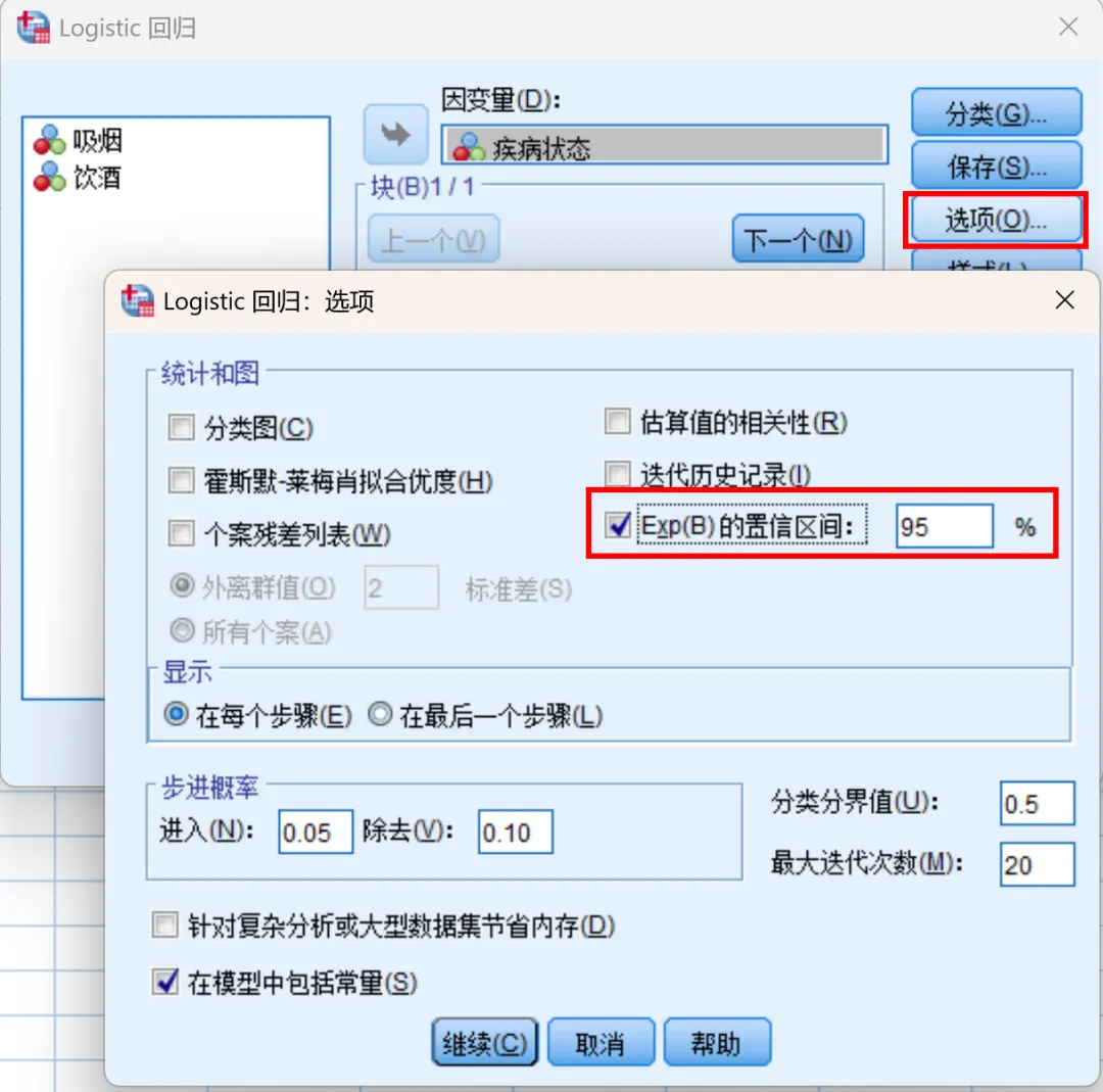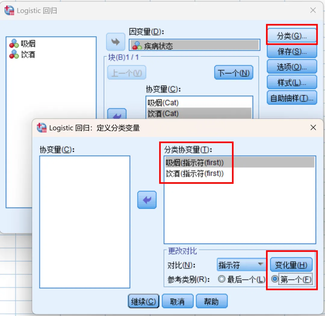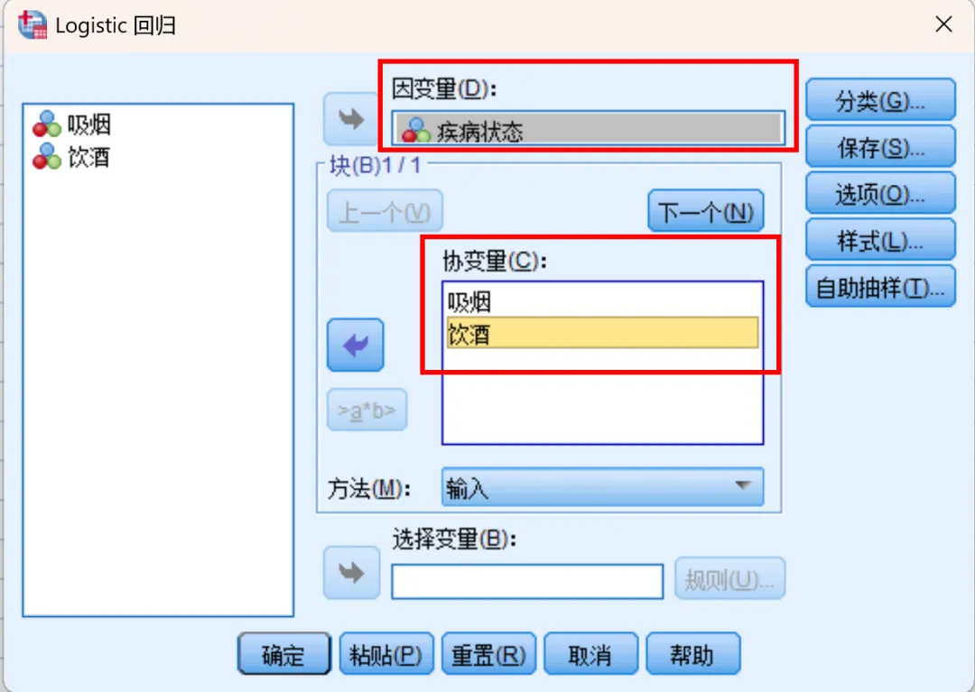2、从左侧变量列表中将“疾病状态”添加到“因变量”框中,将“吸烟”和“饮酒”分别添加到“协变量”框中;