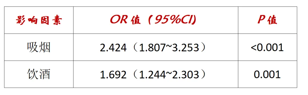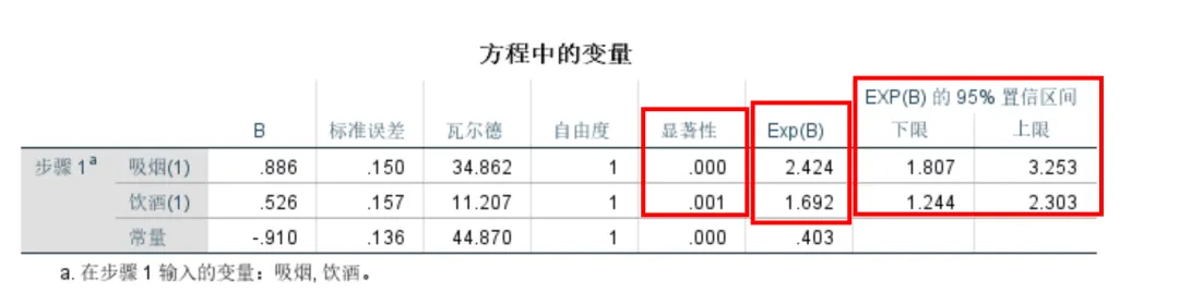 (2)自变量“饮酒”的OR=1.692[95%CI(1.244~2.303)],回归系数假设检验的P=0.001,饮酒对食管癌的效应有统计学意义(呈正向关联,饮酒者相对于不饮酒者来说,发生食管癌的可能性是不饮酒者的1.692倍,饮酒可能是食管癌的一个独立性危险因素);