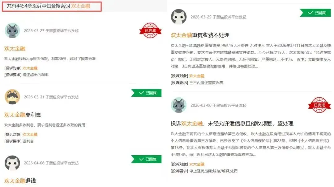然而三年后,黑猫投诉平台显示,欢太金融累计投诉已超4400条。