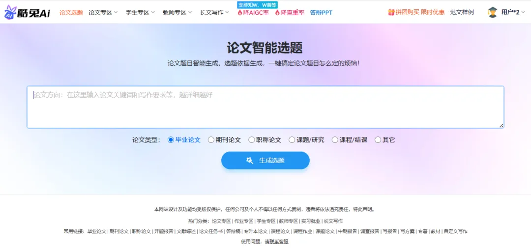 酷兔AI免费提供三级大纲免费生成服务,输入论文题目即可快速生成逻辑清晰的框架,支持简单调整修改,快速搭建论文写作基础结构,同时搭载专属智能选题数据库,覆盖文、理、工、艺全学科,输入专业与研究领域,30秒即可批量生成10个优质选题,方向新颖、贴合当下学术热点,完美解决AI写开题报告、AI写课程论文初期选题困难的问题,适配基础学术写作,为AI写论文、AI论文生成快速锁定创作方向,大幅缩短前期准备周期。
