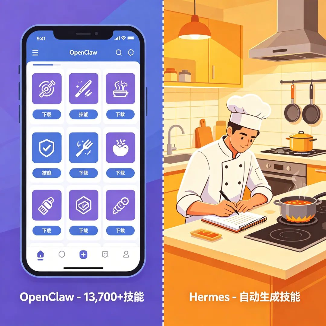 Hermes Agent的技能系统则完全不同。它像一个每次做完菜就发明新菜谱的厨师。