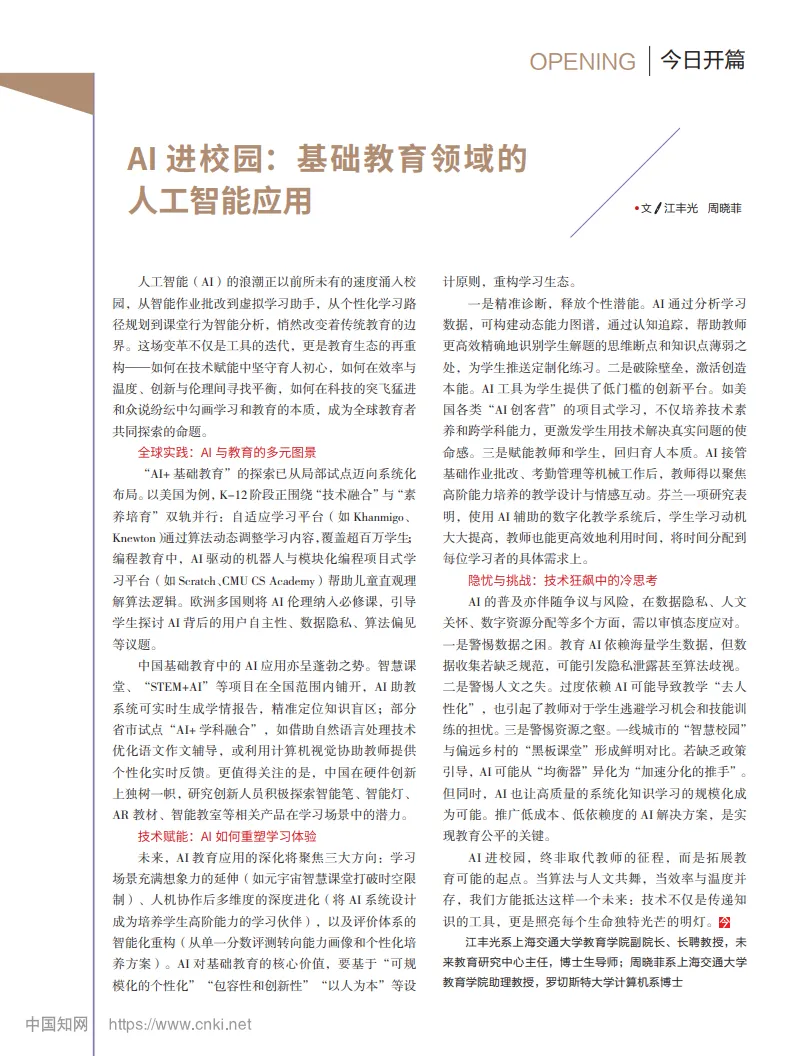 AI 的普及亦伴随争议与风险,在数据隐私、人文关怀、数字资源分配等多个方面,需以审慎态度应对。一是警惕数据之困。教育 AI 依赖海量学生数据,但数据收集若缺乏规范,可能引发隐私泄露甚至算法歧视。二是警惕人文之失。过度依赖 AI 可能导致教学“去人性化”,也引起了教师对于学生逃避学习机会和技能训练的担忧。三是警惕资源之壑。一线城市的“智慧校园”与偏远乡村的“黑板课堂”形成鲜明对比。若缺乏政策引导,AI 可能从“均衡器”异化为“加速分化的推手”。但同时,AI 也让高质量的系统化知识学习的规模化成为可能。推广低成本、低依赖度的 AI 解决方案,是实现教育公平的关键。