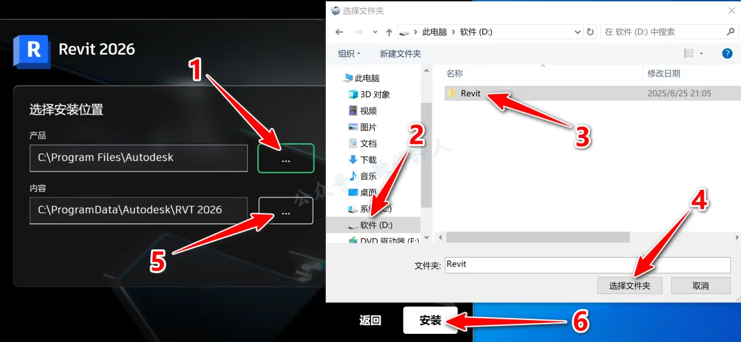6、①点击产品下方的【…】;②选择需要将软件安装的磁盘(如:D盘);③新建一个【Revit】并选中;④点击【选择文件夹】;⑤点击【…】,重复1、2、3、4步;⑥点击【安装】。