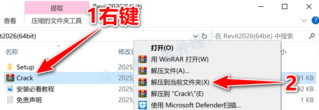 9.打开安装包解压后的文件夹,鼠标右击【Crack】压缩包,选择【解压到当前文件夹】。(提示病毒的话请重复第0步后再解压一次)