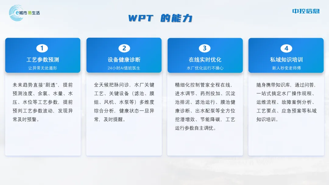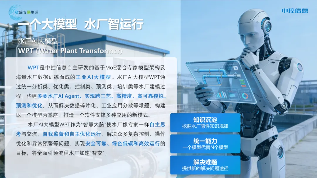 从“智慧大脑”WPT大模型的宏观决策,到“智能高级氧化工艺”的工艺精准控制,中控信息正以全栈式的AI技术能力,引领流程水厂加速“智变”。