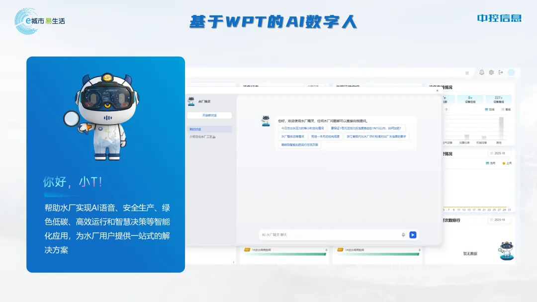 基于WPT技术平台开发的AI数字人,覆盖AI语音交互、安全生产监管、绿色低碳运行、高效流程管控以及智慧决策分析等多维度智能化应用,为水厂用户提供一站式解决方案,有效提升水厂整体运营效率与管理水平。
