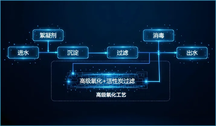 中控信息智能高级氧化工艺采用UV/H2O2(紫外/过氧化氢)+活性炭技术。其核心原理在于利用H2O2吸收UV能量,产生具有极强氧化性能的羟基自由基,有效降解水中致嗅物(2-甲基异炭醇、土臭素等)、抗生素、除草剂等,活性炭工艺负责分解多余的H2O2,确保出水安全。