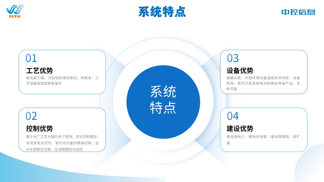 ▶ 控制优势:基于水厂工艺大脑的多个预测、优化控制模型,实现双氧水药剂、紫外光剂量的精准控制,出水水质稳定合格,全流程感知与监控。