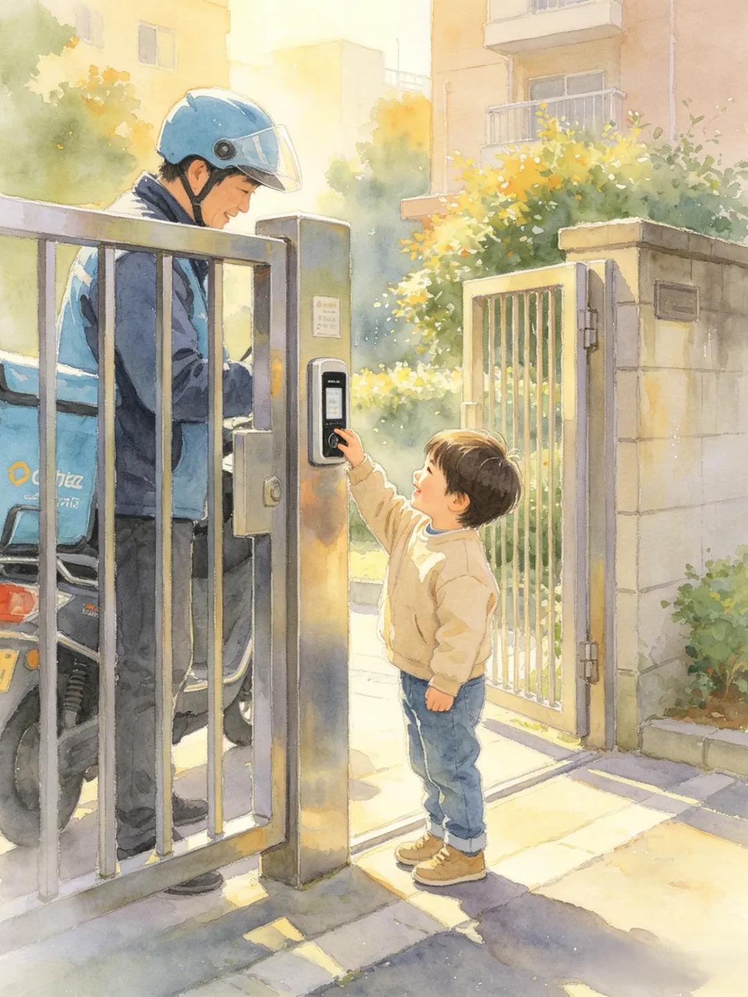 一位外卖小哥走到闸门前。小男孩主动刷开了闸门,让外卖小哥先进来。