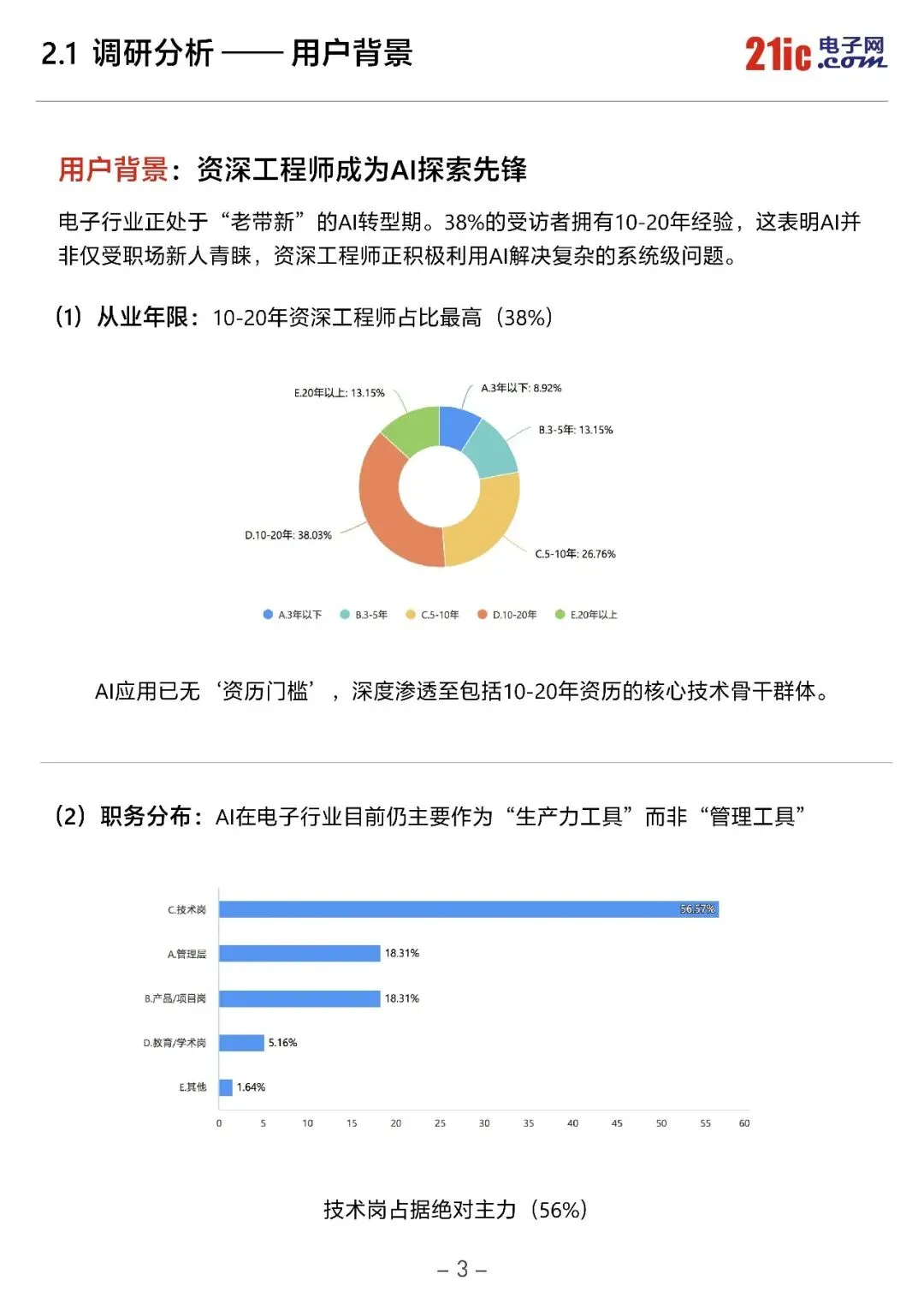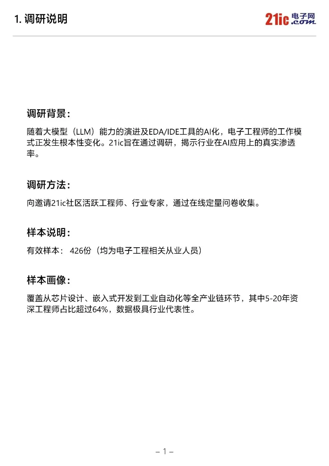 为了看清行业的真实底色,21ic电子网发起并完成了《2026中国电子工程师AI应用现状》的大调查。我们通过问卷形式调研了426位覆盖芯片设计、嵌入式、工业自动化等全产业链的资深开发者,带你拆解这场正在发生的“全栈工作流”革命。