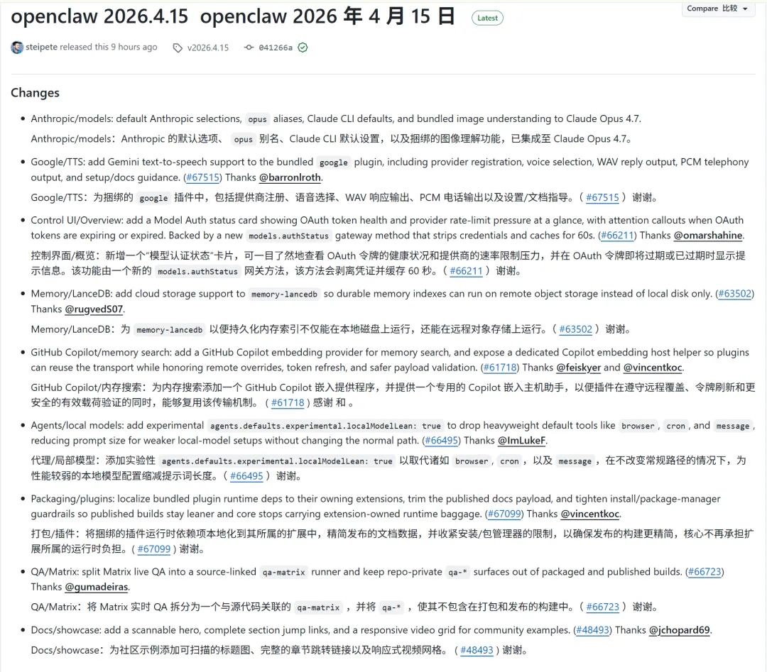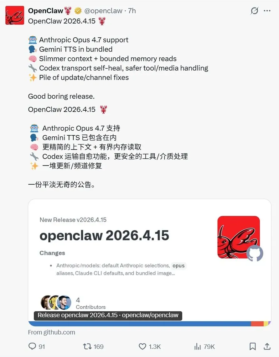 OpenClaw 2026.4.15 这次更新,表面最显眼的是 Opus 4.7、Gemini TTS,还有上下文与 memory 读取变轻。