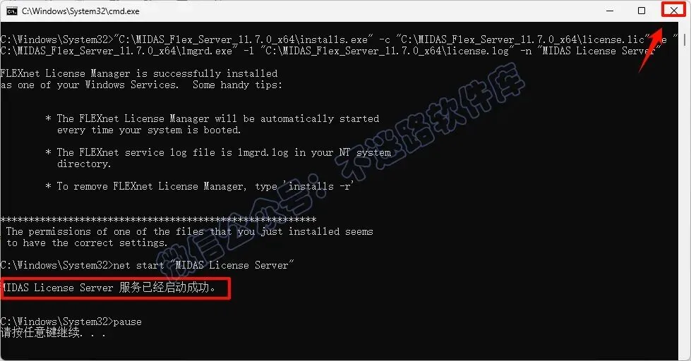 5.提示“服务已经启动成功“,点击右上角的“X“关闭