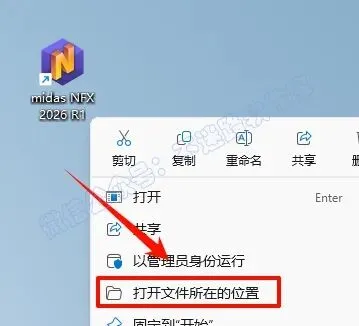 18.选中”midas NFX 2026“软件图标,鼠标右键点击“打开文件所在位置”