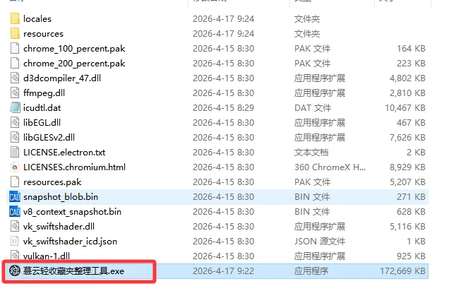 下载 慕云轻收藏夹整理工具 V1.7.2-portable.zip,解压后双击 慕云轻收藏夹整理工具.exe 即可运行。