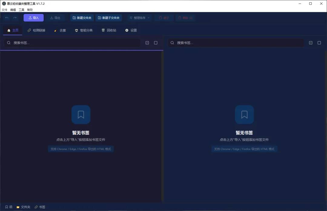 1. 安装与运行2. 界面布局3. 导入与导出4. 书签管理5. 失效链接检测6. 智能分类7. 去重功能8. 回收站9. 撤销与重做10. 设置11. 快捷键12. 常见问题