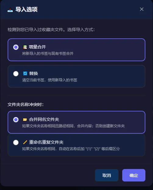 替换 — 用导入的数据完全替换当前收藏夹