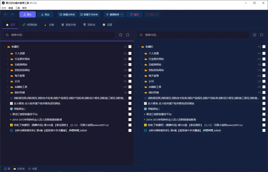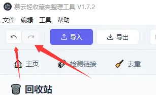 左侧边栏 — 功能切换:收藏夹 / 检测链接 / 智能分类 / 回收站