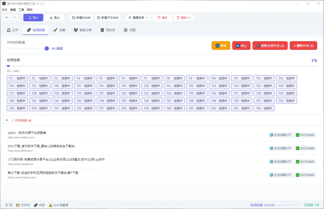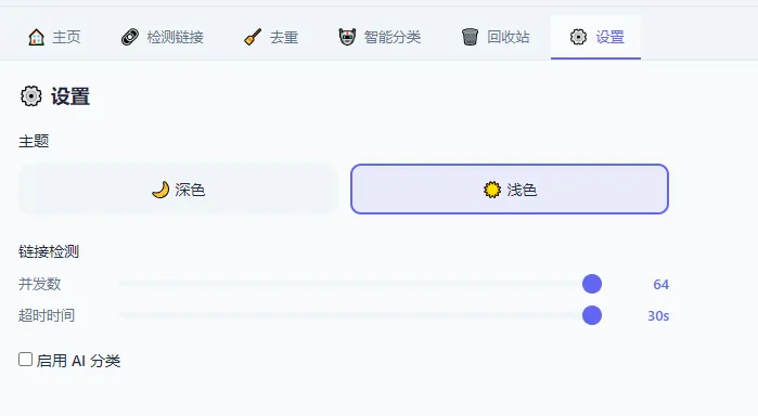 在检测链接页面可调整 并发数(默认 64),数值越高检测速度越快,但也越消耗网络资源。