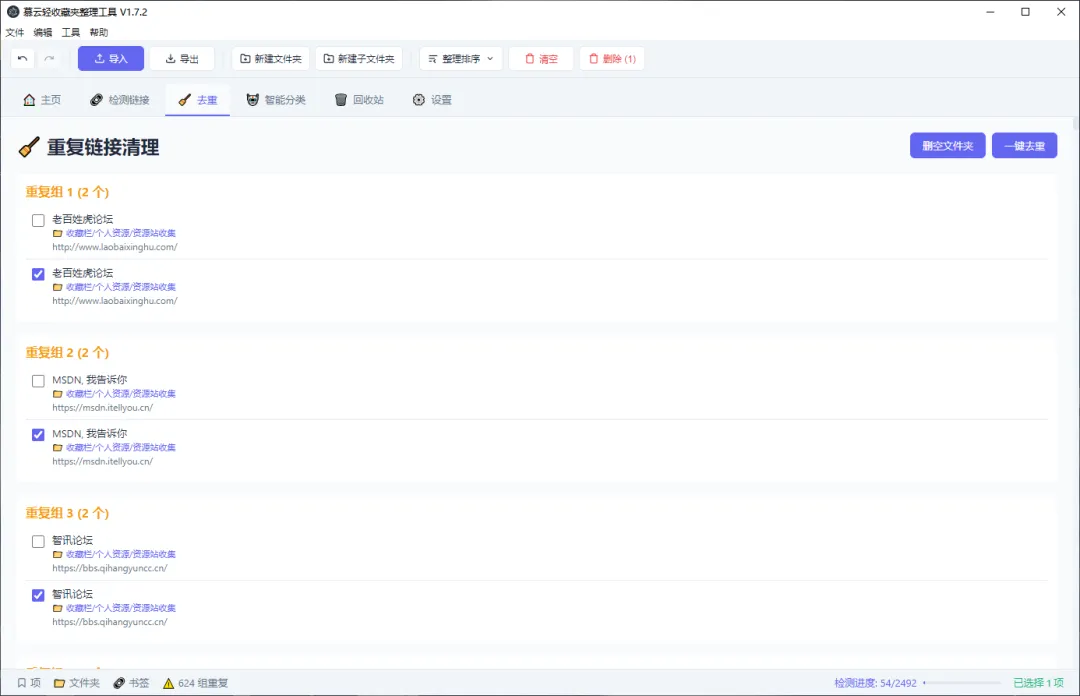 在 去重 标签页中,系统会自动扫描并列出完全重复的书签(相同名称 + 相同网址),显示每个重复组的数量。