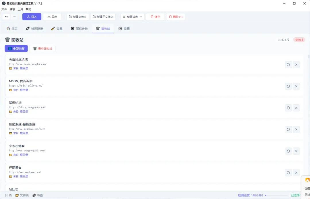 回收站支持按状态(失效 / 超时 / 错误)筛选显示,便于批量处理问题链接。