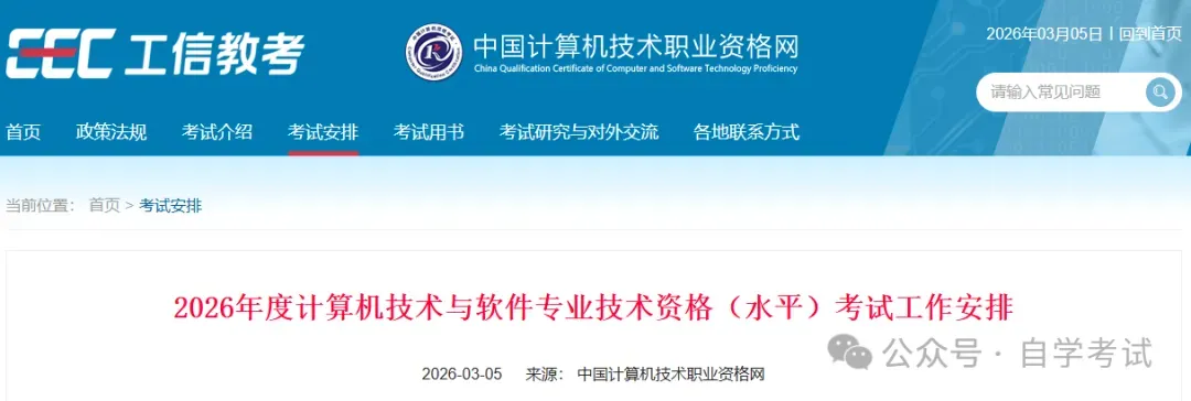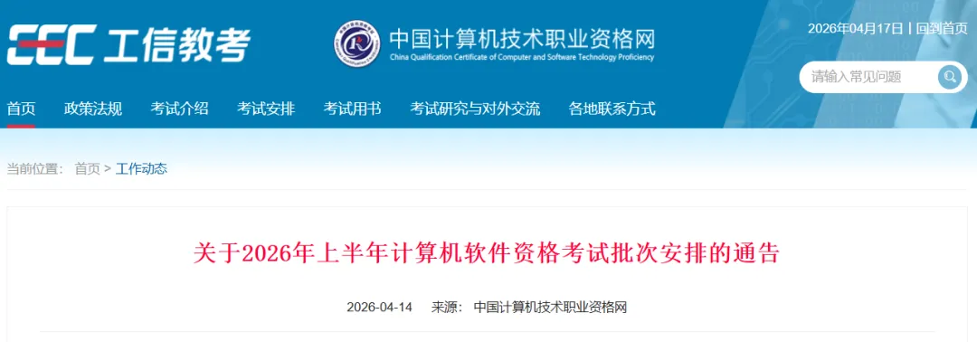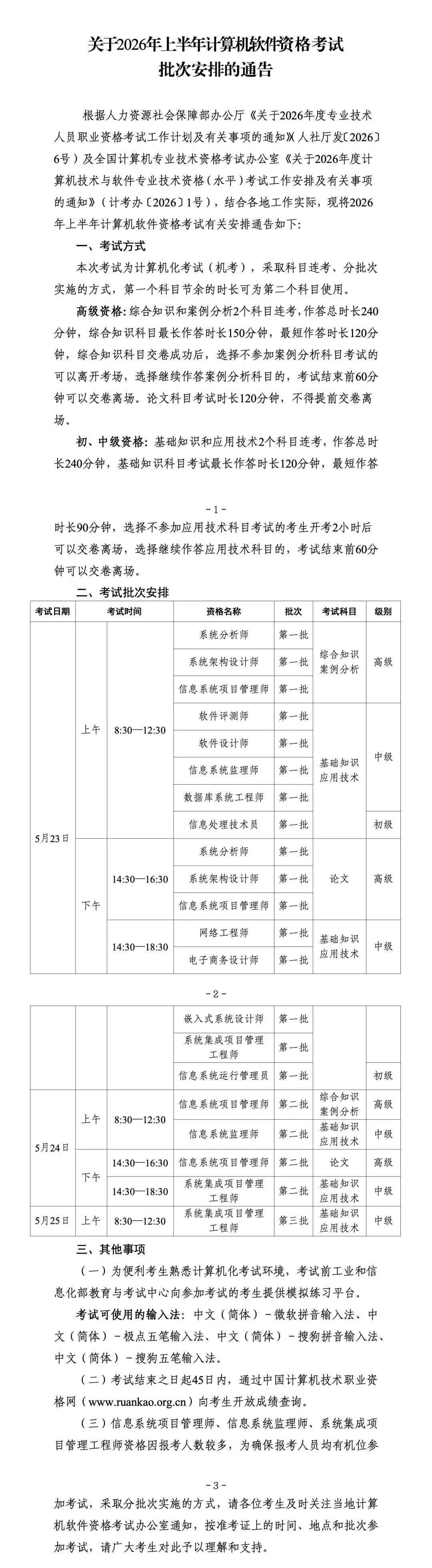 根据人力资源社会保障部办公厅《关于2026年度专业技术人员职业资格考试工作计划及有关事项的通知》(人社厅发〔2026〕6号)及全国计算机专业技术资格考试办公室《关于2026年度计算机技术与软件专业技术资格(水平)考试工作安排及有关事项的通知》(计考办〔2026〕1号),结合各地工作实际,现将2026年上半年计算机软件资格考试有关安排通告如下: