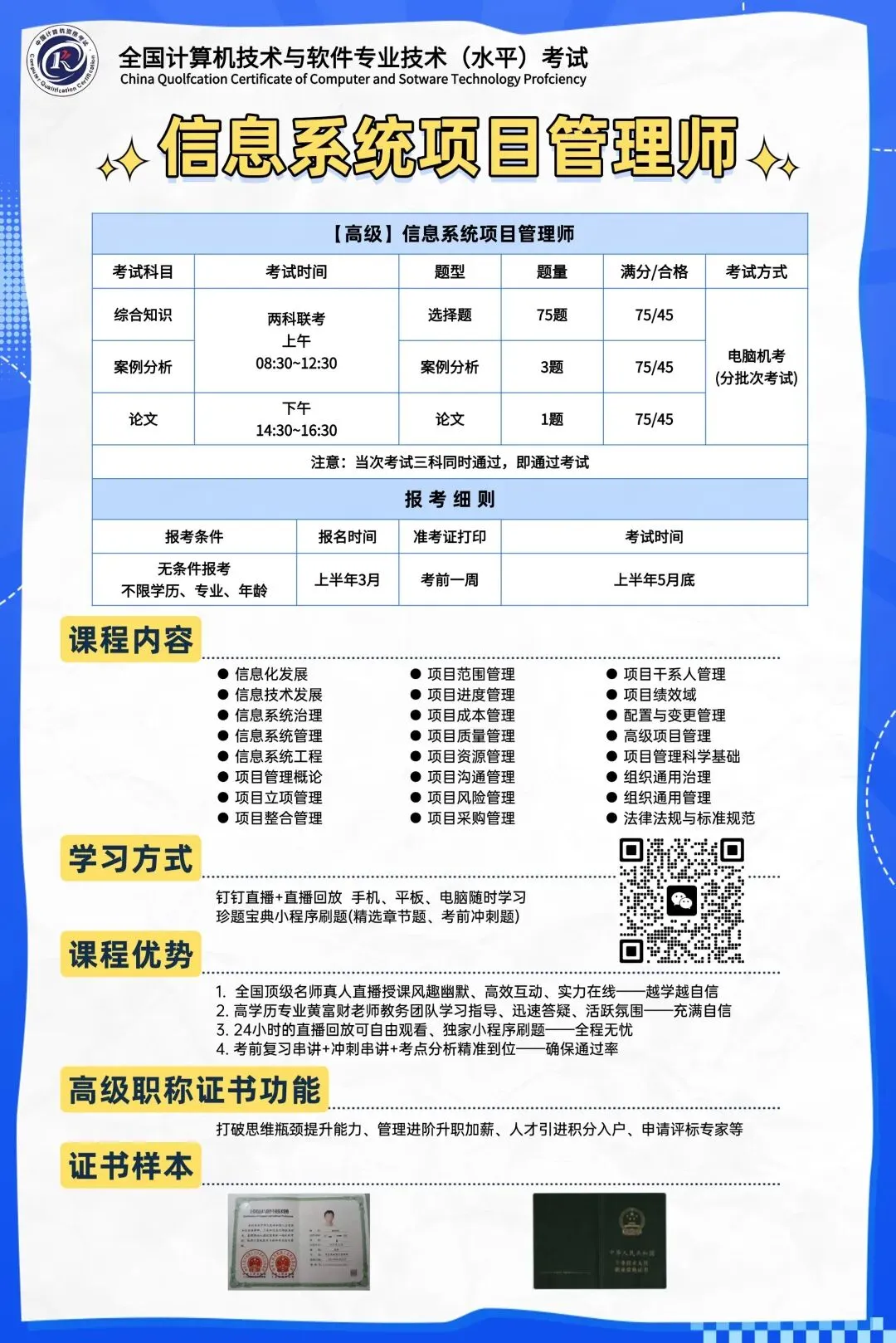 5月24日 | 上午 | 8:30—12:30 | 信息系统项目管理师 | 第二批 | 综合知识案例分析 | 高级 |
