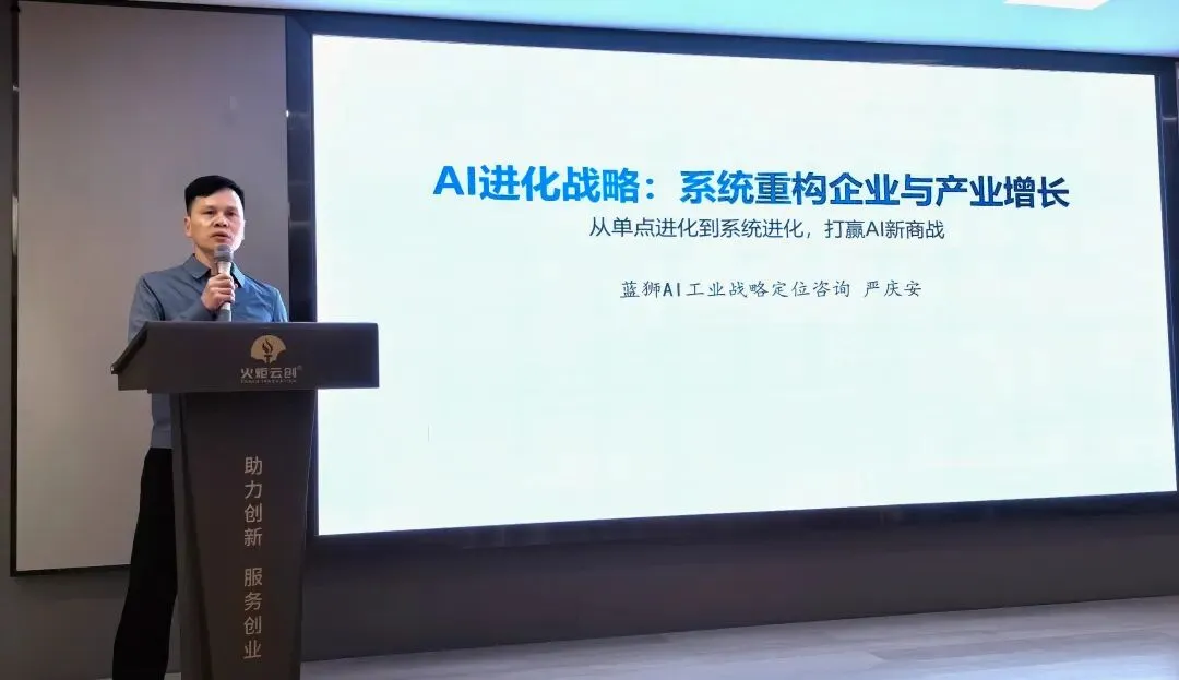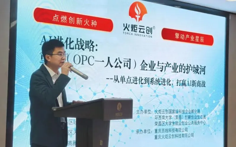 作为荣昌区火炬云创国家级科技企业孵化器推动"AI 科技增长战略" 落地的重要活动,本次沙龙汇聚了政府主管部门、行业顶尖智库、科创企业及高校精英等约45位嘉宾。活动由重庆西线科技有限公司、火炬云创国家级科技企业孵化器总经理龙水维主持,荣昌区科学技术局局长谢军燕在活动中开展科技创新致辞,通过领导致辞、战略导师分享、交流答疑等环节,全方位解读AI时代的产业机遇与政策红利。 活动特邀AI战略定位专家、"AI进化战略" 体系开创者严庆安先生担任主讲导师。严庆安先生现任蓝狮 AI工业战略定位咨询、未来猩小战略咨询总经理,身兼中国电子学会 AI智能体应用开发高级工程师、工信部人工智能训练师、重庆智库理事等数职,拥有辅导 60 余家科技企业实现战略升级、为 40余家制造业冠军企业定制战略的丰富实战经验。他带来长达 60分钟的深度战略分享,解码 AI如何重构 OPC一人公司及产业的核心竞争力,为参会者擘画从单点进化到系统进化的实战蓝图。 (严庆安分享)