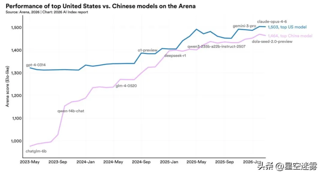 今天,斯坦福大学发布了《2026年人工智能指数报告》。结果有点让人意外——中美AI模型性能差距,已经缩小到只剩2.7%了。