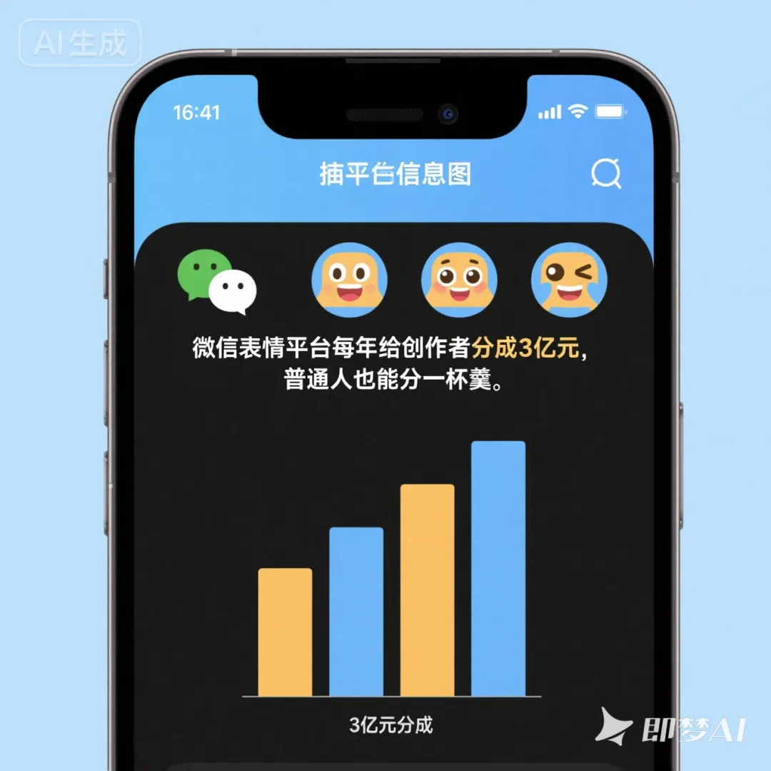 我特意去翻了一下数据,去年微信表情平台全年分成给创作者超过 3 亿元。虽然大头肯定被头部创作者拿走了,但普通人做一套爆款表情下来,每个月多赚两三千,真不是什么夸张的事