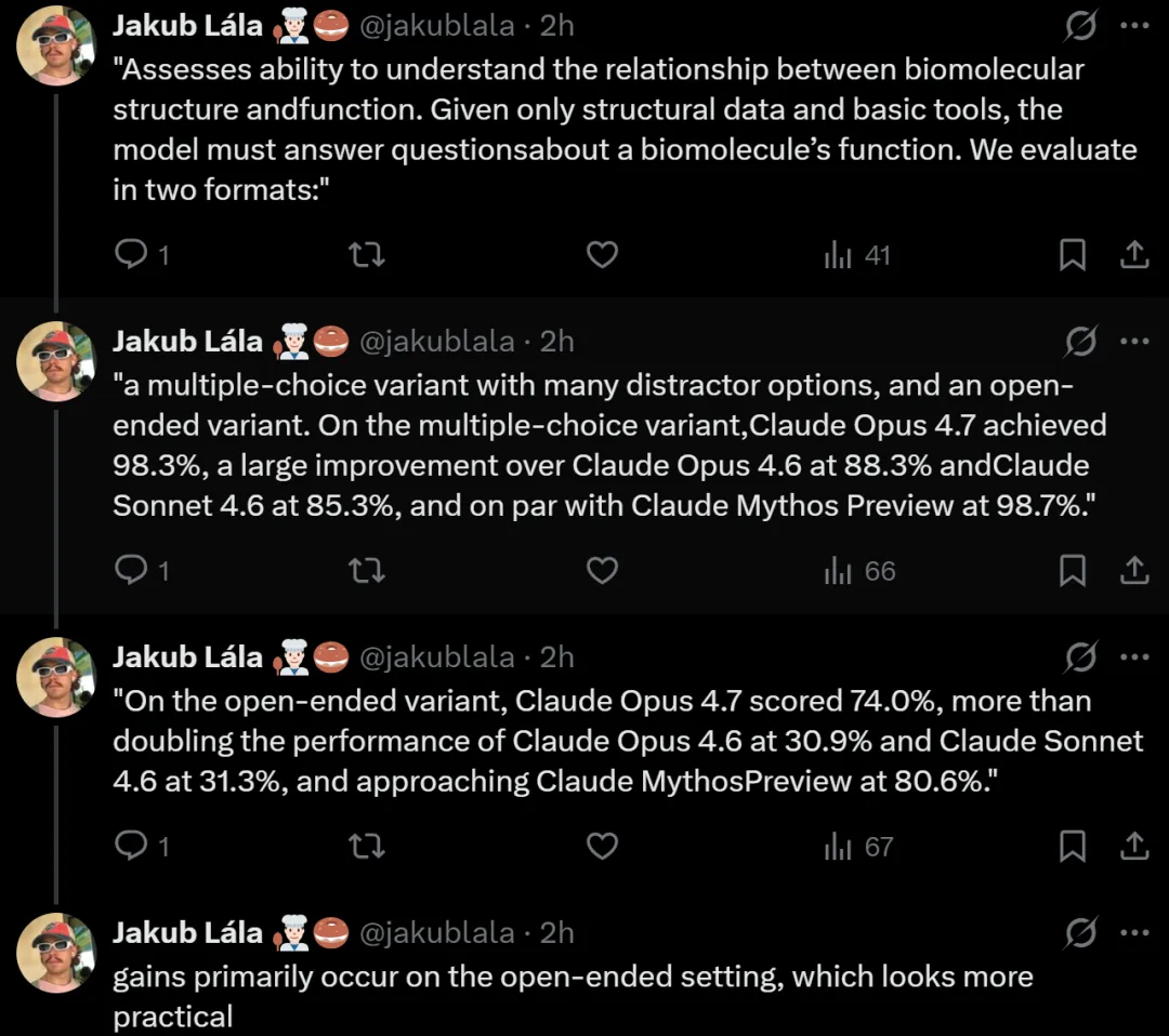 至于生物学,几乎没有人谈。但 FutureHouse 技术团队成员 Jakub Lála 凌晨翻到了 System Card 里一段被折叠的评估,连发了四条。