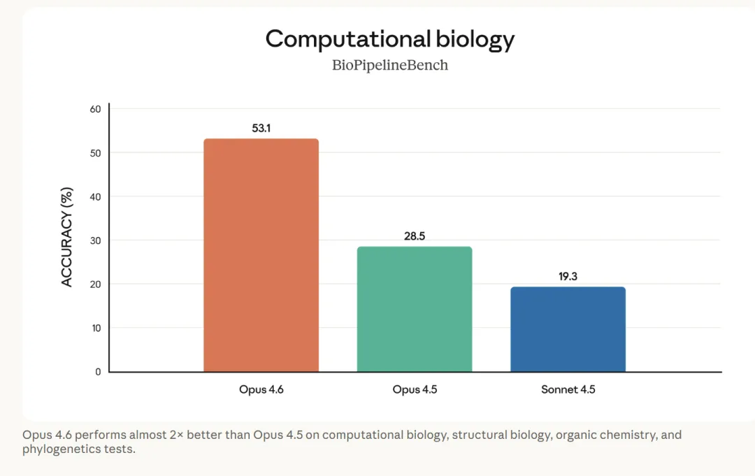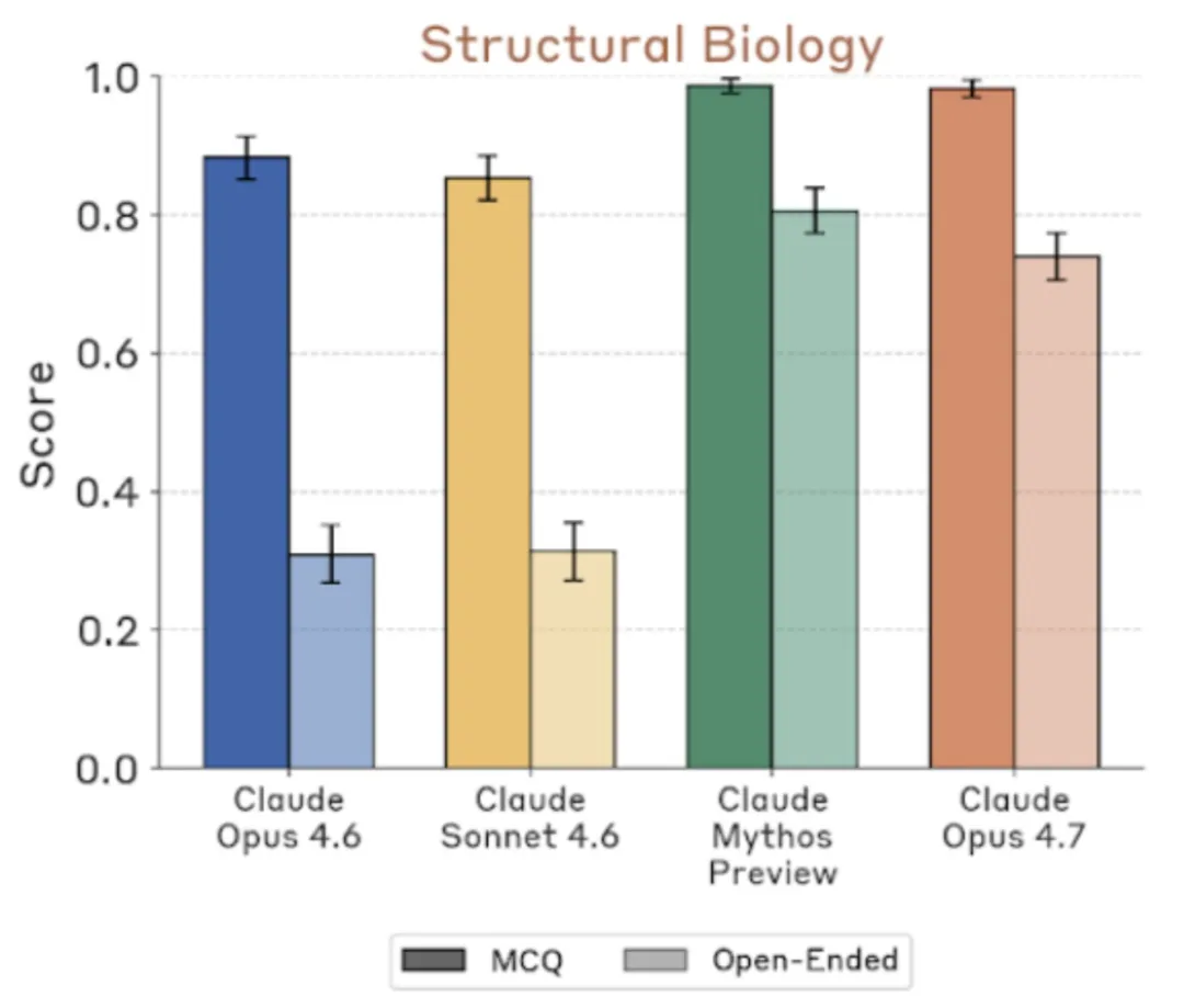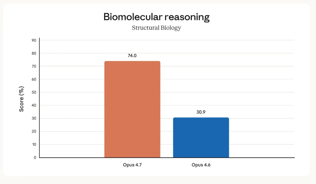第一,Opus 4.6 两个月前的宣传口径就是"计算生物学、结构生物学、有机化学、系统发生学四项综合比 4.5 提升近 2 倍"——那已经是一次大跳跃。Opus 4.7 两个月后,又把其中最硬的一块(开放式结构→功能推理)再翻一倍。
