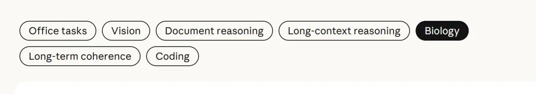 第二,这次发布的主旋律被压在编程上。 Anthropic 自己的官方 blog 把重点全给了 software engineering 和 agentic coding,生物学只作为评估图表里的一个可折叠的 tab 出现。生物这条线的大跳跃,基本靠 System Card 的细节被扒出来。几乎可以说,是 Anthropic 自己把这件事往低调里做的。