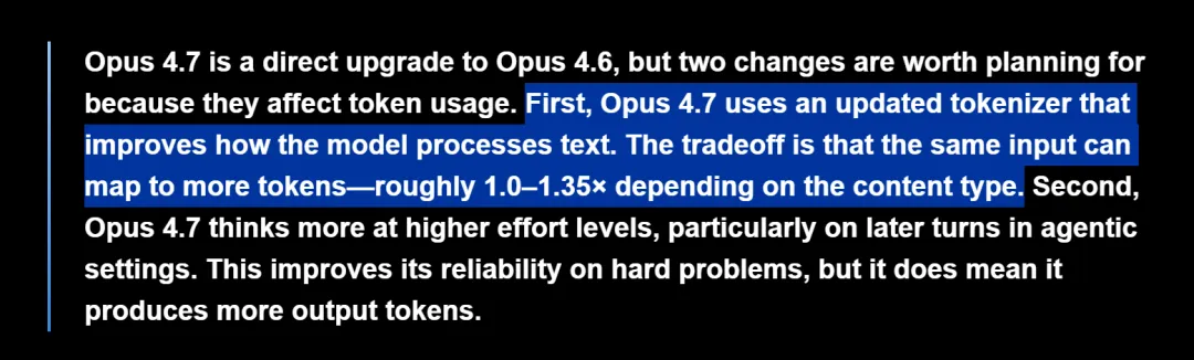 第三,注意成本账。 Opus 4.7 换了 tokenizer,同样输入会比 4.6 多消耗 1.0-1.35 倍的 token;同时在高 effort 下它思考得更多,输出也更长。定价和 4.6 持平($5/M 输入,$25/M 输出),但实际账单会上浮。长文档、长推理的 workflow,重新算一下再切。