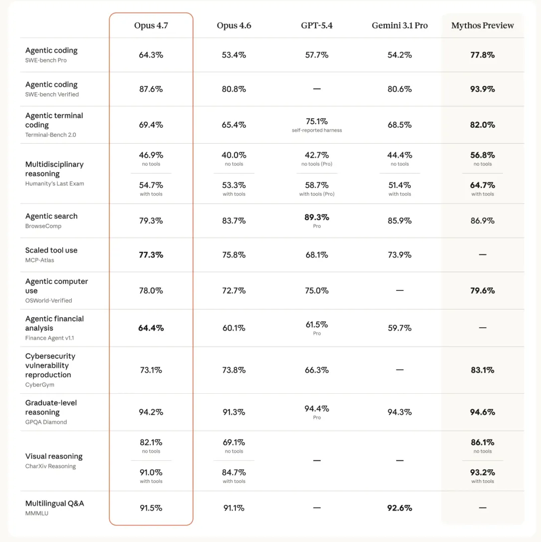 昨晚 Anthropic 发布了 Claude Opus 4.7。全网的头条都是两件事:一个是编程能力又挤过了 GPT-5.4 和 Gemini 3.1 Pro,一个是那个不对公众开放、据说主攻网络安全的 Mythos Preview。