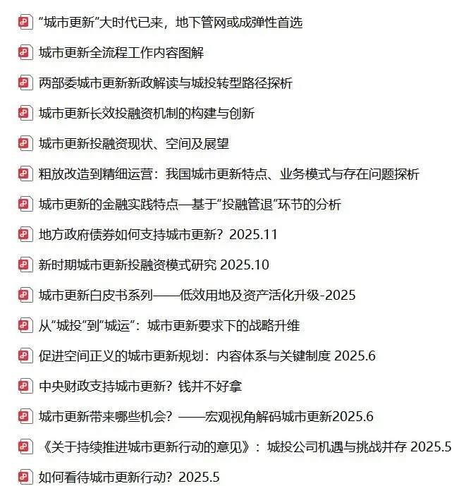 《城市更新资料包 . pdf》限时领取说明:文件来源于官方网站或各大专业研究机构,仅做汇总整理,版权归原机构/作者所有。相关报告截图如下,领取方式简单,见下方:领取方式:4月20日前,扫描下图二维码添加下方张老师微信好友并备注“城市更新”,通过后发送您的名片即会发送资料包。(注:因业务关系,培训机构/未合作过的咨询机构的同业人士、身份神秘或不便透露人士暂不开放领取,请勿添加)下方为近期城市更新相关培训推广“十五五”时期,我国城市发展全面迈入以内涵式增长为主题、以城市更新为核心抓手的存量提质新阶段。2026年两会政府工作报告明确提出“高质量推进城市更新,稳步实施城镇老旧小区、城中村等改造,盘活利用存量土地和闲置房屋设施,建设现代化人民城市”。面对十万亿级的市场蓝海,如何将国家战略与地方实践深度融合,构建兼顾“高质量发展”与“高水平安全”的可持续更新模式,已成为各级政府、平台公司、央国企与市场主体必须掌握的核心能力。在此关键时期,国家与地方层面政策红利密集释放。2026年初,自然资源部与住房城乡建设部联合发布《关于进一步支持城市更新行动若干措施的通知》,在规划适应性、土地政策、不动产登记等方面推出11项突破性举措。城市更新政策解读、顶层设计、实战案例精讲与超长期特别国债、专项债、中央预算内资金项目谋划及资金争取专题培训班培训时间地点2026年4月23-25日(23日报到) 广州市2026年4月28-30日(28日报到) 郑州市培训费:3280元/人(含培训费、税费、资料费);住宿统一安排,费用自理(可自行安排食宿)。报名联系人:张老师 15533610321(同微信)培训内容第一章、“十五五”政策新维度解读与顶层战略一、国家战略定位与实施框架1.“十五五”时期住房城乡建设的转型关键期特征与现代化人民城市目标2. 高质量推进城市更新的总体思路:从“城市体检”到“三类工程”(民生、发展、安全)的系统实施3.“四好建设”(好房子、好小区、好社区、好城区)与城市更新行动的深度融合二、2025-2026年最新关键政策深度解析1.《关于进一步支持城市更新行动若干措施的通知》核心突破2.增强详细规划适应性:技术修正、土地混合利用正面清单、规划许可豁免清单3.优化过渡期支持政策:5年期过渡及土地手续办理新规4.创新资源资产组合供应与不动产预告登记等配套支持5.“两重”(重大战略、重大安全工程)、“两新”(新型基础设施、新型城市建设)项目在城市更新中的融合与机遇第二章、城市更新最新国家与地方政策深度解读一、国家、地区城市更新政策关键要点与核心导向1.中央城市工作会议精神与城市更新战略定位2.中办、国办《关于持续推进城市更新行动的意见》重点解读3.住建部关于全面开展城市体检工作的指导意见要点解读4.中办、国办《推进新型城市基础设施建设打造韧性城市意见》要点解读5.财政部《城市更新专项债券管理办法(2025)》二、广州城市更新最新政策深度解析1.《广州市支持高质量城市更新促进精细化空间治理的规划用地管理若干措施》(2026年3月发布)核心突破2.《广州市城中村改造条例》核心要点3.广州市城市更新“1+1+N”政策体系概览4.《广州市低效用地再开发试点工作实施方案》要点解析第三章、社会资本参与城市更新项目模式及案例解析一、城市更新及运营的业务模式分析1.市政管道类更新改造:地下老旧管网更新、燃气管道改造等2.商业街区与老旧小区改造:智慧化升级、活力街区打造 3.低效用地再开发:工业用地连片整合、存量空间盘活二、城市更新项目的运作模式、实操路径1. 城市更新项目实施流程及主要操作步骤解析2. 城市更新的五步闭环:从体检到落地谋划及案例分析三、城市更新专项债(专项贷款)业务跟进重点及案例解析1. 聚焦“三大任务”(民生工程、市政基础和城市安全)2. 跟进重点项目的“任务清单”3. 提高城市更新专项债(专项贷款)项目获取成功率4. 社会资本参与城市更新的价值贡献四、国家开发银行(国开行)贷款专题1.支持方向与重点领域 2.支持模式与金融工具 2.1中长期优惠贷款(主力工具)2.2专项贷款/基金2.3“投资+贷款”联动2.4融资模式创新与引导3.项目申报与落地要点 4.国开行城市更新专项贷款五、城市更新实操重点与难点突破1、资金筹措难点破解1.1社会资本引入模式、金融产品创新(如专项债、REITs)2、历史文化保护与活化2.1重庆、成都等历史文化街区、工业遗产保护实操技巧3、产业适配性提升3.1产业片区规划的空间供给谋划的北京策略4、生态韧性建设与城市更新融合路径4.1海绵城市、防洪排涝、地下综合管网建设5、核心支撑要素包装技巧5.1土地管理:土地权属、用途转换流程、复合利用规划要点等5.2规划设计:“绣花”类微改造、完整社区建设等5.3风险防控:隐患排查、资金平衡风险、社稳风控等第四章:城市更新项目投融资模式及案例解析一、城市更新项目的三大类资金申请要点及谋划方式(一)政府投资1. 财政拨款 / 2.城市更新专项债 / 3.政策性金融机构专项借款(二)政府联合社会资本1.新机制PPP模式 / 2.地方政府+房地产企业+产权所有者模式(三)创新型探索1.城市更新基金 / 2.投资人+C+EPC+O / 3.公募REITs与资产证券化二、城市更新项目纳入储备库的条件与操作步骤1. 城市更新三大类资金申报