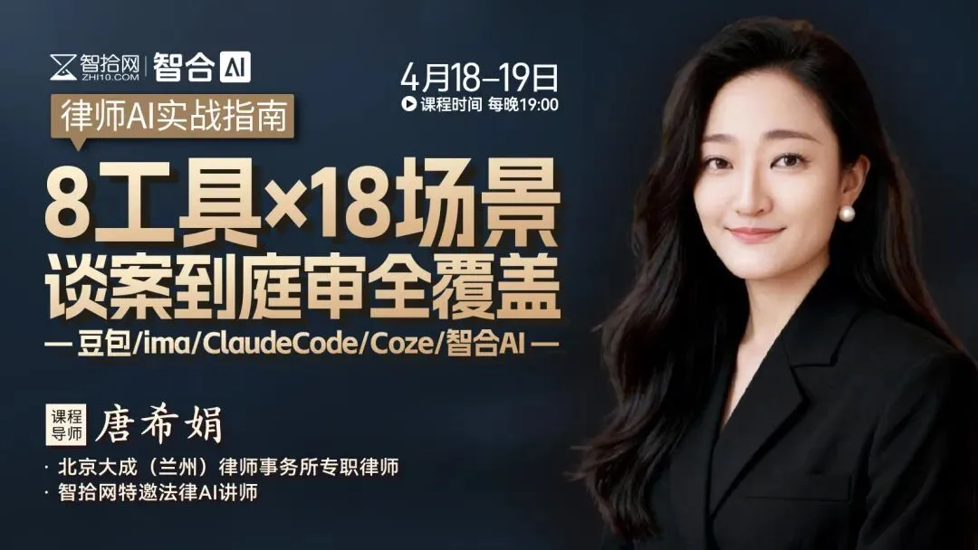 4月18-19日19:00,智拾网邀请到AI法律专家、北京大成(兰州)律师事务所唐希娟律师,开设《律师AI实战指南:8工具×18场景,谈案到庭审全覆盖》直播课,系统讲解豆包、ima、Claude Code等8大工具如何赋能18个实战场景。