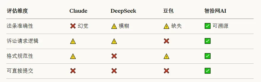 显然,智拾网AI工具,在诉讼请求表述、论证逻辑、文书格式、法条引用的准确性与可溯源性等多个维度上,均明显优于其他三款AI,其生成的文书也是唯一一份可以直接作为初稿使用的文书。