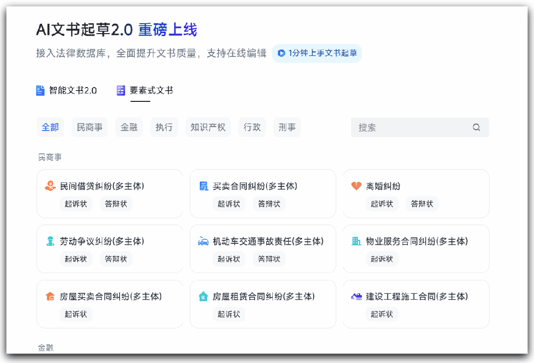 律师日常需要的文书,这里都有——民商事、金融、执行、知识产权、行政、刑事,六个领域,41种文书类型。