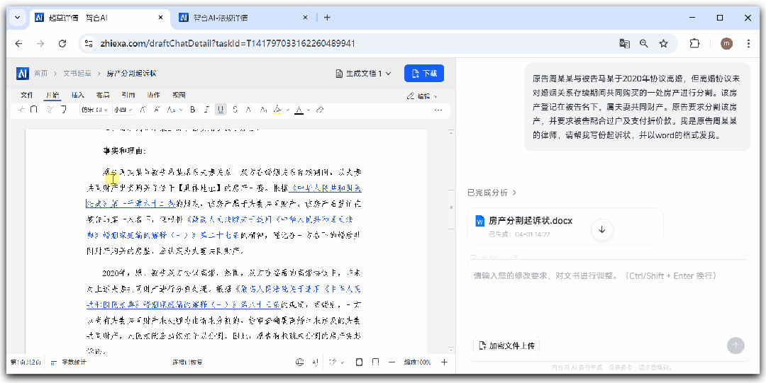 此外,智拾网AI工具还支持在同一界面内完成修改与润色,左侧实时呈现文书内容,右侧对话窗口随时可以追问或指令调整。